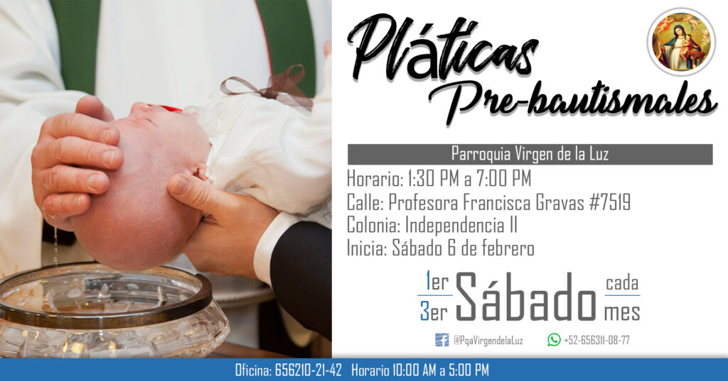 Tenemos platicas pre-bautismales el primer y tercer Sábado de cada mes.